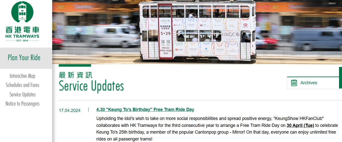 CC: Though I have yet to enjoy it, I remember being so impressed by all tram rides being free on Keung To’s birthday. I remember thinking, ‘wow, that is the power of Mirror’.